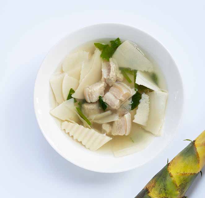 Una vez cocidos, los tallos de bambú tienen un sabor suave y sutil, con un fondo ligeramente amargo y muy característico, con una textura crujiente que los hace muy agradables tanto en ensaladas como en platos calientes. Han formado parte de la dieta de países asiáticos como China, Indonesia, La India, entre otros, durante siglos. Se comen encurtidos, en sopas o en salsas acompañando carnes y pescados. Existen también recetas que incorporan tallos de bambú fermentados. Se suelen servir cortados en tiras pequeñas y finas.